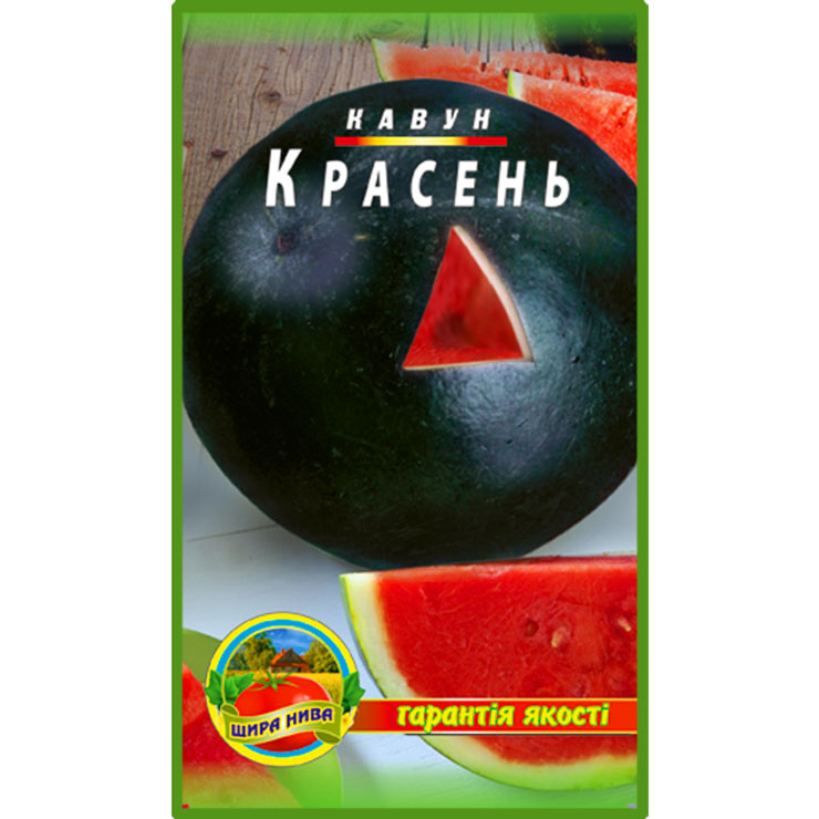 Кавун “Красень”. Ранньостиглий сорт кавуна , від сходів до початку дозрівання 65-67 днів. Плоди кулястої або еліптичної форми, поверхня гладка, чорно-зеленого, зрідка темно-зеленого кольору , з восковим нальотом. Кора середньої товщини (10,0-12,0 мм). М’якоть червоного кольору, ніжна, соковита, солодка. Дегустаційна оцінка 4,5-4,8 бала. Маса середнього плоду 4,0-5,0 кг.