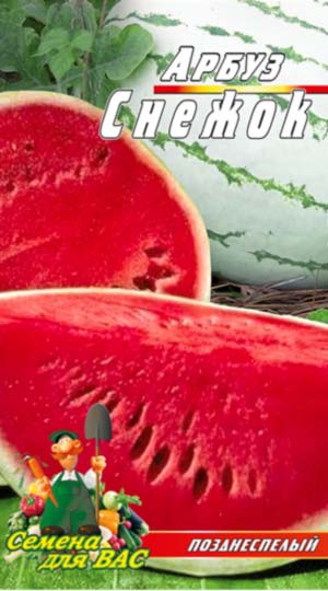 Арбуз " Снежок ". Сорт позднего срока созревания, от всходов до начала созревания плодов 85 – 108 дней. Плоды шарообразной формы, белого цвета, с едва заметными светло-салатными полосами, поверхность гладкая, иногда слегка сегментированая. Кора средней толщины ( 11-14 мм ). Мякоть темно-розового цвета, зернистая, сочная, очень сладкая. Масса среднего плода 5,5 кг. Транспортабельность хорошая. Семена мелкие, черного или темно-коричневого цвета, гладкие.