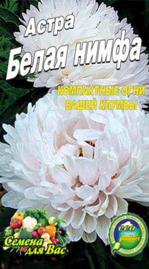 Айстра піоновидна Біла німфа Однорічна рослина. Кущ колонновидний, висотою 50-70см. Квітконоси слабообліственні, довжиною 35-50см. Суцвіття махрові, діаметром 8-12см, білого кольору. На кущі формується до 30 цвіт на погонах першого та іншого порядків. Використовують для зрізу. При посіві насіння, слід пам’ятати, що проростання насіння не переносить пересихання ґрунту, а також лишню вологість і різкі колівання температури. каталог насіння квітів ► Астра Біла німфа ► однорічні квіти каталог