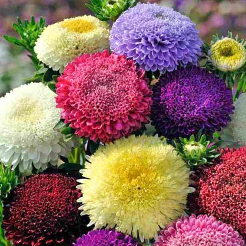 Айстра “Супер принцеса” суміш. Однолітник. Суміш окрас високорослих, обмаль астр з великими густо махровими суцвіттями. Кущі широко-розлогі, міцні, висотою 60-70 см. Суцвіття-кішки напівсферичні, майже кулясті, схожі на піоновідні, 9-11 см у діаметрі. Цвітіння раннє та тривале, з третьої декади липня до морозів. Рослини використовуються для оформлення квітників, від особисто підходять для зрізання.