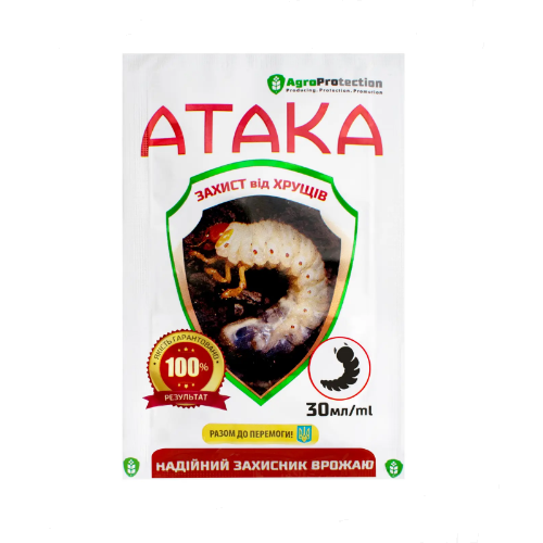 Додаткові ПАР у складі інсектициду подовжують ефективність його дії та забезпечують добре прилипання до поверхні рослин. Препарат Атака Хрущ ефективно використовується для захисту картоплі, капусти, томатів, перцю, яблуні, груші, вишні, персика, абрикоса, смородини, малини, полуниці, винограду, троянд від личинки хруща, дротяника, колорадського жука, картопляної молі, совки, капустянки, попелиці, трипсу, білокрилки, а також рослиноїдних кліщів.