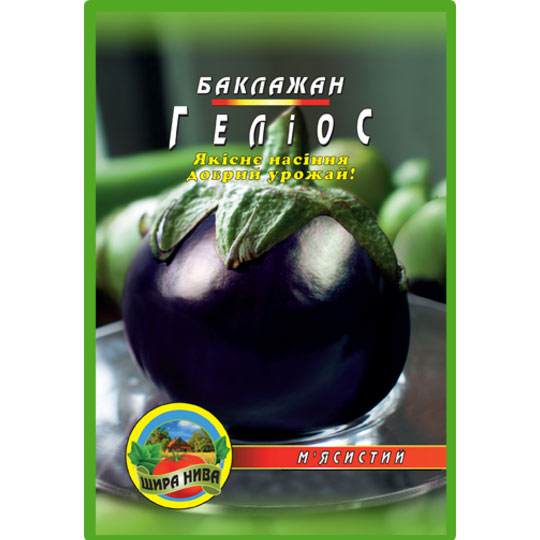 Баклажан “Геліос”. Середньо-ранній сорт. Вегетаційний період від сходів до технічної стиглості 95-120 днів. Кущ сильно рослий, висотою 70-100 см. Плоди великі, овальної форми, в біологічній стиглості червоно-фіолетового забарвлення, масою 200-300 г. М’якоть щільна, кремова, ніжна та смачна. Вирощувати баклажан рекомендується через розсаду. Плоди використовуються для консервації, переробки та в домашній кулінарії.