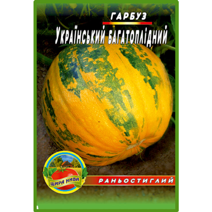 Гарбуз Український багатоплідний. Сорт ранньостиглий, теплолюбний. Від посіву до збору – 88-92дні. Стебло довге, сланке, до 10м Насіння висівають з 10 по 15 травня під плівку, а 10-16 червня плівку прибирають. Лунки для посіву роблять продовж грядки через 90см, глибиною 6-7см. В лунки сіють по 2 насінини, після сходів одну рослину видаляють. Головне стебло прищеплюють коли він достигне 1,3-1,5м, залишаючи 2 бокових пагони довжиною 60-70см, лишні пагони видаляють. В період росту гарбуз сильно поливають раз на тиждень з розрахунку 15-20л води на 1 кв.м. Зрілі гарбузи зрізають з плодоніжкою довжиною 5-6см. Добре зберігається до весни.