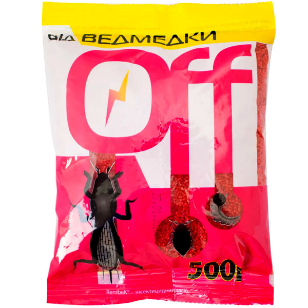 Гранули від Ведмедки Офф 500 г – інноваційна форма принади для ефективного знищення шкідників, призначена для використання в сільському господарстві та приватному секторі. OFFвід Ведмедки – готова до застосування принада для боротьби з ведмедкою (вовчком, капустянкою), дротянкою та личинкою хруща на овочевих (картопля, томати, огірки, баклажани і т.д.), квіткових, ягідних (полуниця, малина, аґрус та ін.) культурах;