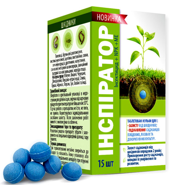 ІНСПІРАТОР – це інсектицидні таблетки системної дії, які захищають від сисних та листогризучих шкідників та сприяють кращому приживлюванню саджанців плодових, лісових та декоративних культур, а також забезпечують їх основним поживним речовинами.                 .