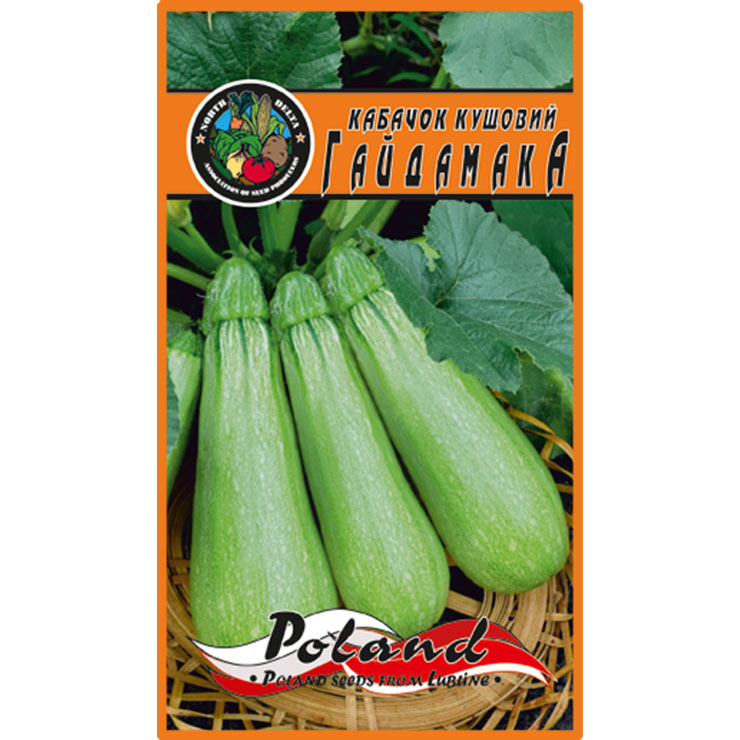 Кабачок “Гайдамака”. Ранньостиглий сорт кабачка. Від сходів до першого збору плодів 38-42 дня. Рослини з компактним кущем. Плід циліндричної форми, прямий або трохи вигнутий з ребристістю біля плодоніжки, світло-зеленого кольору. Середня маса плоду 300 г. Сорт відносно стійкий до борошнистої роси, має підвищений вміст сухих речовин, відмінні смакові якості. Використовують для консервування, переробки та в домашній кулінарії.