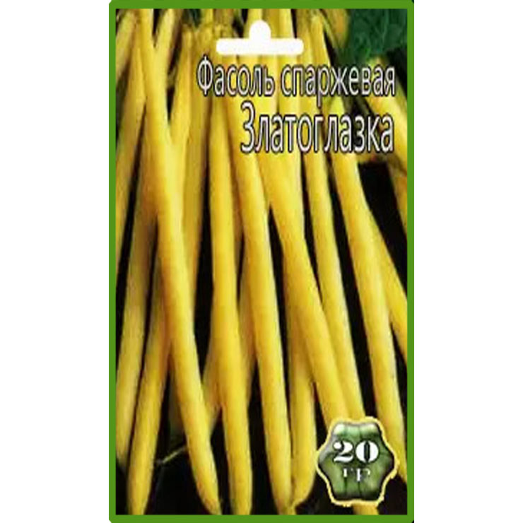 Квасоля спаржева “Златоглазка”. Низькорослий дуже продуктивний ранній сорт безволокнистий (спаржевої) стручкової квасолі. Готовий для збору через 67 днів після посіву. Довжина стручка до 25 см. Рослина потужна висотою до 1 метра, має потребу в опорі. Боби мають жовто-зелений колір. Зерна золотисті, овальні. Сорт дуже врожайний, боби достигають дружно, довго зберігають смакові якості, не мають волокон. Сорт квасолі стійкість до захворювань.