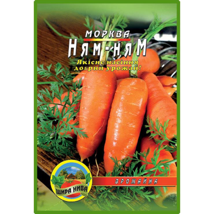 Морква “Ням-ням” . Пізній сорт моркви. Придатний для використання у свіжому вигляді та для консервування. Коренеплоди великі, циліндричної форми, яскраво-оранжевого забарвлення, довжиною 15 см, лежкі. Не вимоглива до грунту, не розтріскується. Придатна для посадки під зиму та навесні, а також для зимового зберігання.