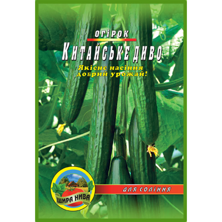 Огірок “Китайське диво”. Пізньостиглий сорт . Вегетаційний період від сходів до початку плодоношення 60-70 днів. Рослина тепло- та вологолюбна, довгоплетиста. Плоди циліндричні, злегка зігнуті, рідко горбкуваті, завдовжки 40-50 см, з тонкою шкіркою, без гіркоти. Використовуються для соління та консервування цілими або порізаними шматочками, а також для споживання в свіжому вигляді. Рекомендується вирощувати у відкритому грунті та в плівкових теплицях.
