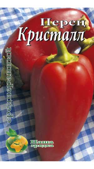 Перець “Кристал” Середньостиглий сорт солодкого перцю , до технічної стиглості 116 днів. Високоврожайний сорт. Кущ висотою 48-55 см. Плід висячий, конусоподібний, масою 50-60 г, в технічній стиглості – кремовий, в біологічній має яскраво-червоний колір. М’якоть ароматна, солодка, товщина стінок 4-6 мм. Призначений для вирощування у відкритому грунті. Культура тепло- та вологолюбна.