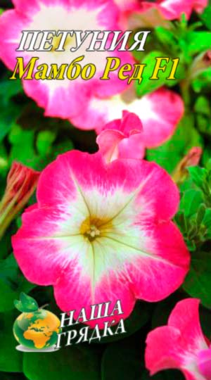 Петуния " Мамбо Ред " F1 . Однолетнее растение. Крупноцветковая серия, очень рано вступает в цветение. Роскошное однолетнее растение с высокой устойчивостью к неблагоприятным погодным условиям. Эта гибридная форма петунии имеет объемный компактный и ветвистый кустик высотой 25-35 см и диаметром 25-30 см. Цветки розовые с белыми пятнами, очень крупные, до 10-13 см в диаметре. Посев проводят с февраля по март. При зимнем посеве всходам необходима подсветка. Всходы появляются через 7-12 дней. На постоянное место высаживают, когда минует опасность заморозков. Цветет с конца мая весь сезон.
