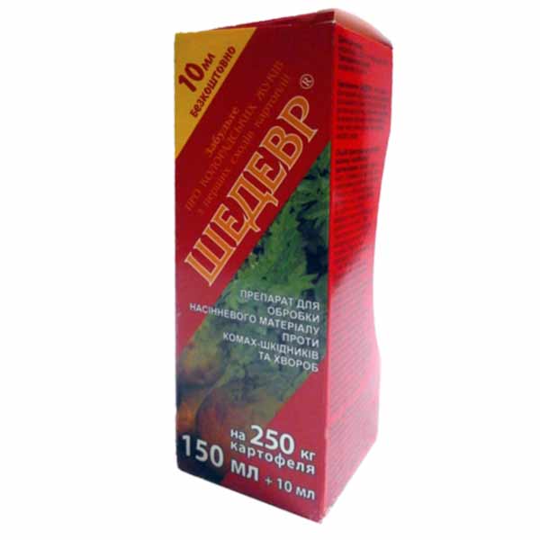 "Шедевр" – инсектицидно-фунгицидный протравитель надежно защищает клубни и молодые растения картофеля от насекомых – вредителей, грунтовых вредителей и болезней всходов. Протравитель "Шедевр" используют для обработки семян зерновых культур, семян и корневой системы рассады овощей.