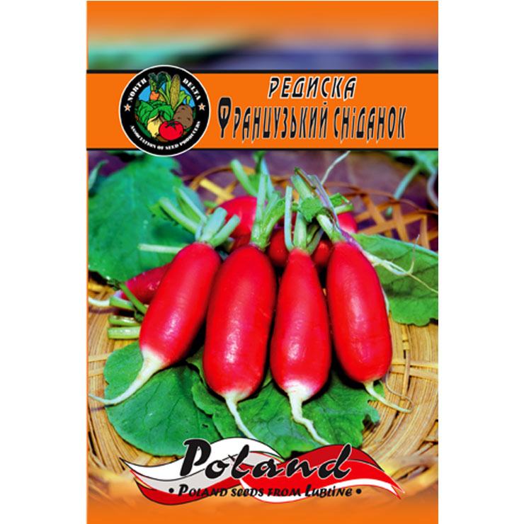 Редис “Французький сніданок”. Ранньостиглий сорт редису. Період від посіву до отримання врожаю в закритому грунті 16-18 днів, у відкритому 20-22 дня. Коренеплід червоний з білим кінчиком, овально-подовженої форми, висотою 5-7 см., Гладкий. М’якоть біла, щільна соковита ніжна, без гіркоти. Маса 18-36 г. Посів насіння у відкритий грунт : початок квітня – середина серпня. Глибина посіву: 1,5 – 2 см