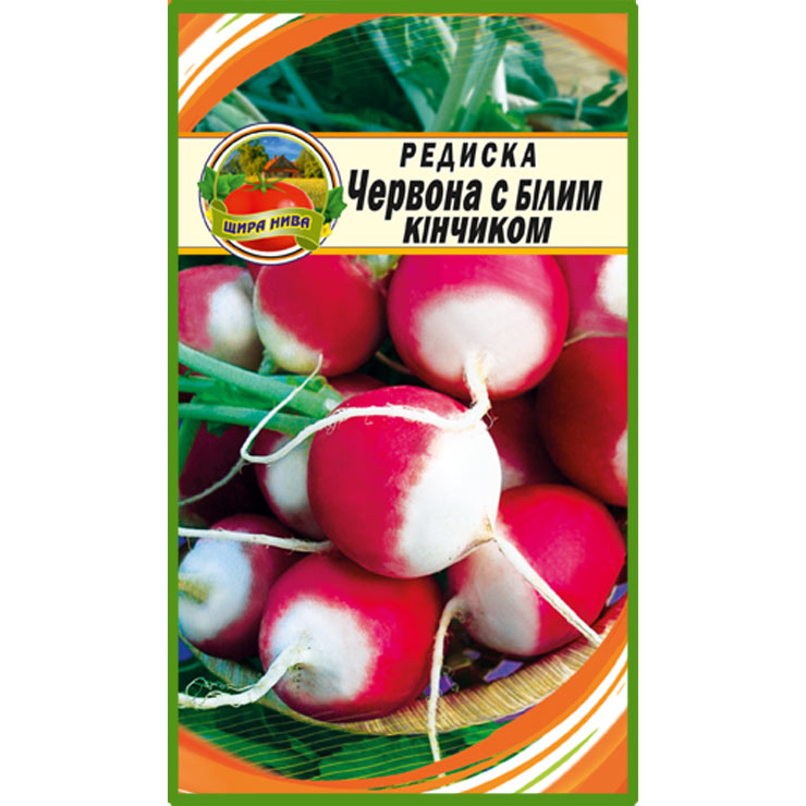 Редиска Червона з білим кінчиком”. Високоврожайний сорт, середньостиглий 22-25 днів, посухостійкий сорт з високими смаковими якостями. М’якоть біла, ніжного напів-гострого смаку. Рекомендується для вирощування у відкритому та закритому грунті. Висока ефективність обробітку забезпечується пізньо літнім посівом.