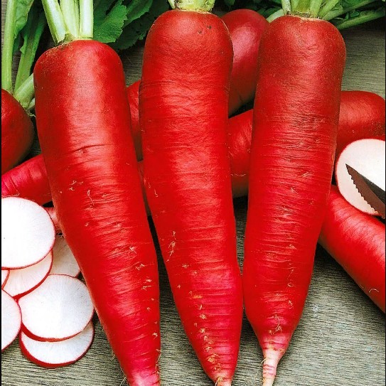 Редиска “Червоний велетень “. Середньостиглий високоврожайний сорт для відкритого ґрунту, вегетаційний період 35-40 днів. Коренеплоди оригінальної форми (схожі на моркву), злегка підняті над поверхнею ґрунту, довжиною 12-13 см, масою 45-100 г. Колір шкірки яскраво-малиновий з біло-рожевою поперечною борозенчастістю. М’якуш білий, соковитий, слабо-гострого смаку, довго не дрябне. Врожайність 2.4-4.5 кг/м2.