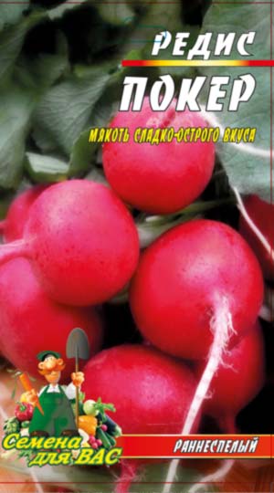Редис ” Покер ” . Ранний сорт редиса для выращивания в стеклянных теплицах, под пленкой и в открытом грунте. Хорошо переносит недостаточную освещенность в осенне-зимний и ранне-весенний периоды выращивания. Небольшая ботва, стандартные однородные ярко-красные корнеплоды, в диаметре 2-3 см, имеют превосходный вкус, при перестое на корню не образуют пустот, очень долго сохраняют товарный вид. В открытом грунте урожай созревает на 20-24 день после появления всходов, в закрытом – на 18-20 день.