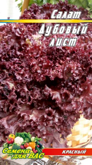 Салат красный " Дубовый лист " (семена). Данный сорт салата является краснолистным салатом типа Листовой. Выращивают весной, летом, осенью. Обладает скорым вегетационным периодом, первый надрез допускается сделать уже через 20-25 дней. За весь период вегетации допускается сделать 3-4 среза. Растение формирует розетку красных широкополосных листьев. Сорт салата Дубовый лист красный хорошо устойчив к стрелкованию.