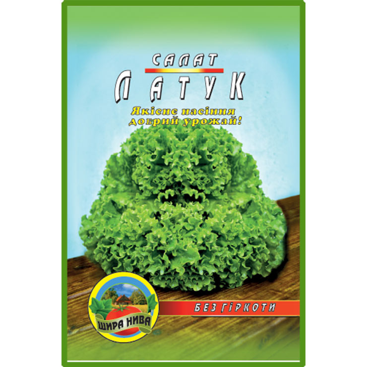 Салат “Латук” Відомий сорт, дозрівання 68-72 дня. Кучеряві смачні і соковиті світло-зелене листя формують округлий качан. Сорт стійкий до основних захворювань і не боїться холодів. Використовується для свіжих закусок і салатів, для соусів і перших страв, а також в декоративних цілях.