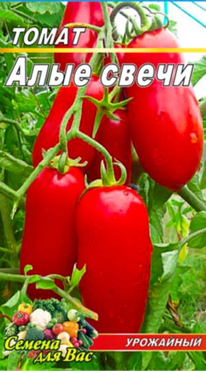Томат “Червоні свічки”. Середньостиглий рожевоплідний сорт з гарною врожайністю, призначений для теплиць і плівкових укриттів. Кущ індетермінантний, високорослий , необхідність формування та підв’язування куща, рекомендується формування в 2-3 стебла. Кількість зеленої маси помірне. Плоди зібрані в кисті по 3-4 штуки. Врожайність хороша, близько 12 кг з 1 кв. м під плівкою. Томати дозрівають протягом усього сезону. Плоди подовжені, циліндричні, зі злегка загостреним кінчиком. Шкірочка не товста, але щільна, добре оберігає томати від розтріскування. В процесі дозрівання колір змінюється зі світло-зеленого на насичено-рожевий. Смак дуже приємний, насичено-солодкий. Високий вміст цукрів і мікроелементів робить томати придатними для дитячого та дієтичного харчування. Плоди добре зберігаються, можливе транспортування. Зелені томати доходять до повної стиглості при кімнатній температурі. Сорт універсальний, підходять для салатів, вживання в свіжому вигляді, приготування супів, гарнірів, соків. Придатний для засолювання та маринування, дуже гарний в складі овочевих асорті.
