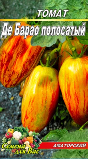 Томат “Де Барао”, смугастий. Рослина високоросла, індетермінантного типу. Суцвіття компактне, з 5-7 плодами овально-яйцевидної форми масою 60-70 г. Незрілий плід зеленого кольору з інтенсивною зеленою плямою в місці прикріплення плодоніжки, при дозріванні смугастий. Плоди щільні, смачні, відмінні для консервування, довго зберігаються не втрачаючи якості. Сорт має підвищену стійкість до фітофторозу.