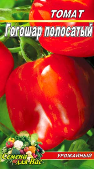 Томат “Гогошар смугастий”. Оригінальний середньостиглий (термін дозрівання 110-120 днів) сорт томата. Плоди відрізняються характерною кубовидною формою і смугастим забарвленням. Кущі високорослі, висотою 1,5 м, вимагають підв’язки. Плоди смугасті – помаранчеві смуги на червоному тлі, вага до 150 г, зовні дуже схожі на сорт перцю “гогошари”. М’якоть плодів щільна, приємного солодкуватого смаку, хороша в салатах. Пустотілі плоди придатні для фарширування. Після збору зберігаються досить довго.