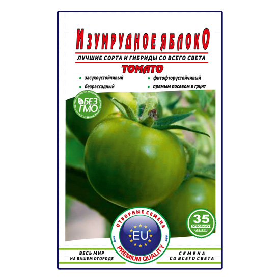 Томат “Смарагдове яблуко”. Середньо-ранній високоврожайний сорт. Кущ індетермінантний, досягає 1,5 м у висоту. Рослина потужна, добре облистнена, потребує формування. Плоди зібрані в кисті по 3-7 штук. Томати великі, багатокамерні, вагою в 250-300 г. Форма плоско-округла, слабо ребриста. Колір зрілих помідорів дуже незвичайний, насичено-зелений з лимонним або бронзовим відтінком. Смак делікатесний, дуже приємний, солодкий з легкою кислинкою, насичений, що не водянистий. М’якоть соковита, щільна, смарагдово-зелена. Високий вміст цукрів і корисних амінокислот дозволяє рекомендувати томати для дитячого і дієтичного харчування. Сорт російської селекції призначений для вирощування у відкритому грунті і плівкових теплицях. Урожай непогано зберігається, можливе транспортування. Томати універсальні, вони підходять для вживання в свіжому вигляді, приготування салатів, закусок, гарнірів.