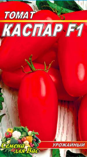 Томат “Каспар F1” Високопродуктивний гібрид томату голландської селекції (Ройс Слюйс) з товстими, м’ясистими плодами перцевидної форми . Термін дозрівання 119 днів. Середня маса плоду 100 г. Сухих речовин 5-5,7 %. Розмір рослини – середній. Стійкий до вертицильозу і фузаріозу. Середньоранній гібрид для відкритого грунту і плівкових укриттів. Допущений для використання по Центрально-Чорноземному регіону на садово-городніх ділянках, присадибних і дрібних фермерських господарствах. Рослина детермінантна. Перше суцвіття закладається над 8-9 листком, наступні – через 1-2 листа. Плід циліндричний, масою 72-87 г, стійкий до розтріскування. Смакові якості відмінні, придатний для консервування.