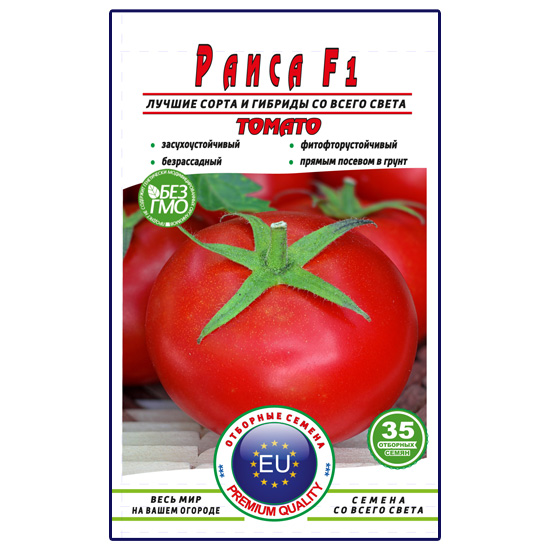Томат “Раїса F1”. Ранній індетермінантний гібрид, вегетаційний період від висадки розсади 55-60 днів, найпопулярніший гібрид в сегменті стандартних томатів, плоди округлі, темно-червоні, дуже щільні і транспортабельні, з блиском, без зеленої плями, середня вага 150-170 гр, однорідні плоди протягом усього сезону, мають дуже привабливий вигляд і приємний смак.